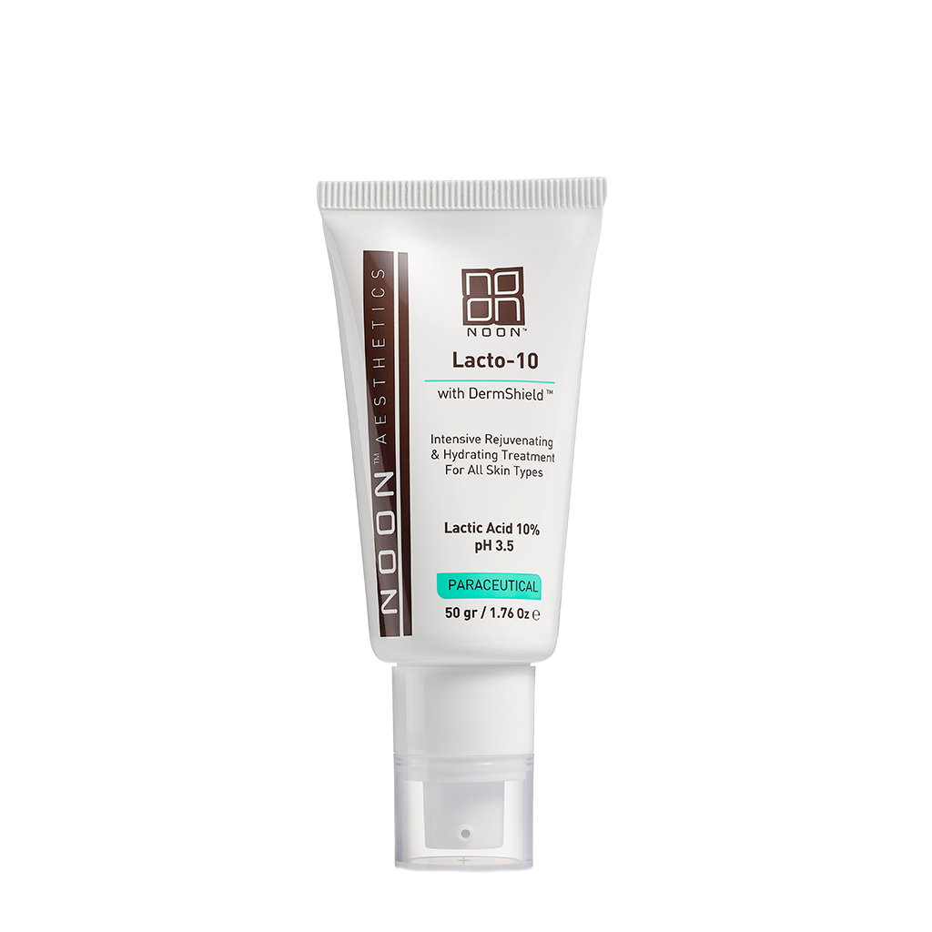Lacto-10 mit 10% Milchsäure (pH 3,5) ist eine leichte ölfreie Creme, die die Hautverjüngung beschleunigt, die Hautstruktur verfeinert und ihren Farbton sowie ihre Feuchtigkeit verbessert. Das Additiv DermShieldTM (Patent angemeldet) ermöglicht die Anwendung der Creme bei allen Hauttypen. Zu jeder Jahreszeit und ohne die typischen Irritationen, die normalerweise mit der Verwendung von Alpha-Hydroxysäuren (AHA) verbunden sind. Lacto-10 kann während der Schwangerschaft und Stillzeit verwendet werden.